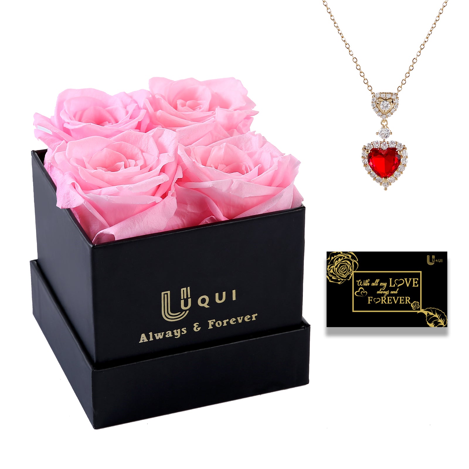 - U UQUI Valentines Day Gifts Set: As a brand that deeply cultivates flower gifts, preserved flowers set is the perfect Valentines gift you've been looking for. 4 pink roses in square box instead of rose bouquets are more ornamental and gift-like. Ruby necklace adopt heart design radiates dazzling light. The black gilded greeting card u uqui prepared for you to help express your sincerity.