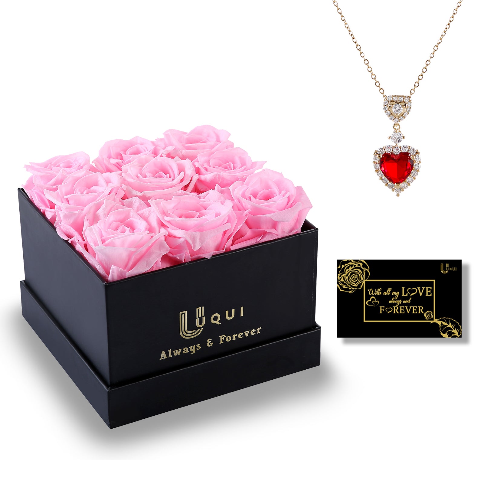 - U UQUI Valentines Day Gifts Set: As a brand that deeply cultivates flower gifts, preserved flowers set is the perfect Valentines gift you've been looking for. 4 pink roses in square box instead of rose bouquets are more ornamental and gift-like. Ruby necklace adopt heart design radiates dazzling light. The black gilded greeting card u uqui prepared for you to help express your sincerity.