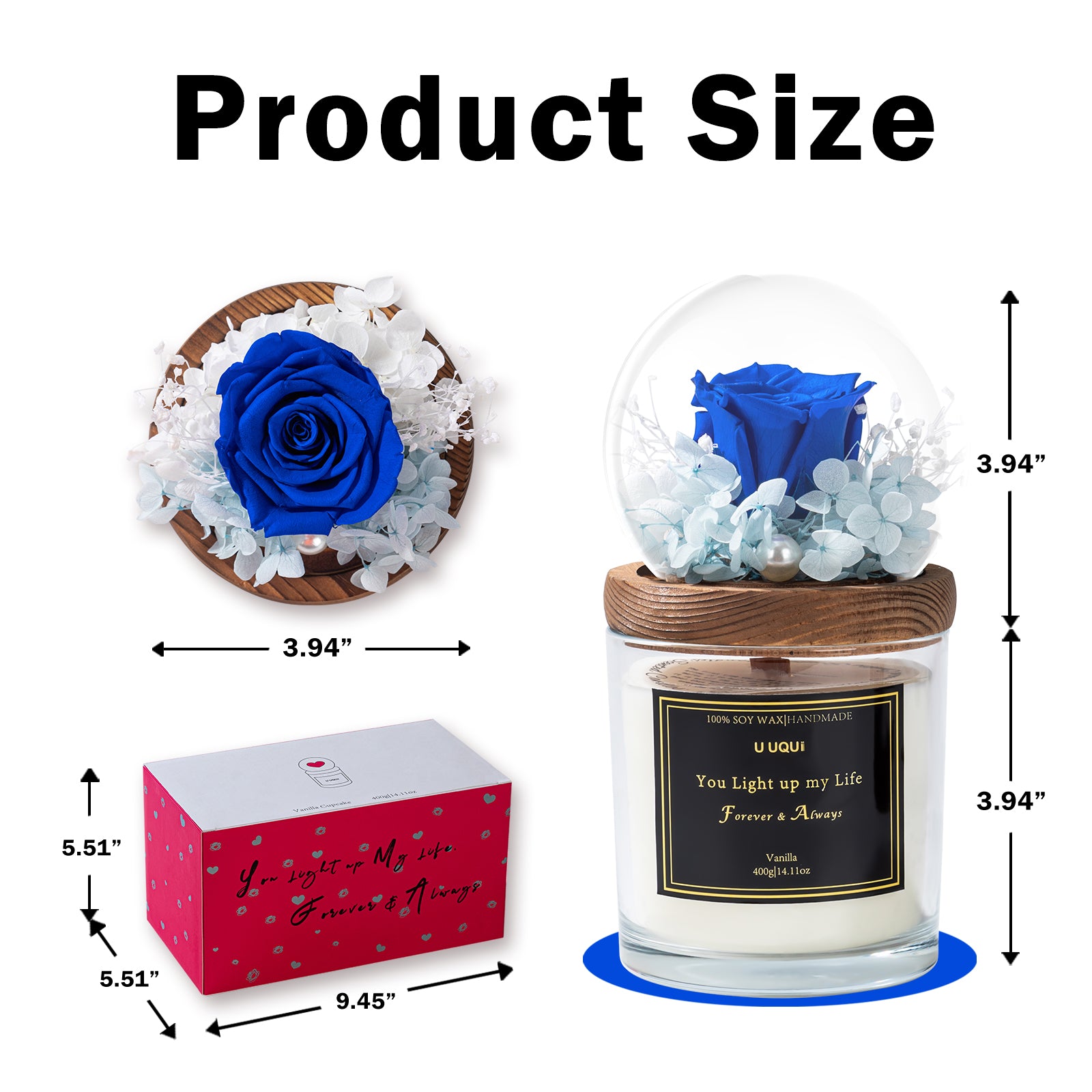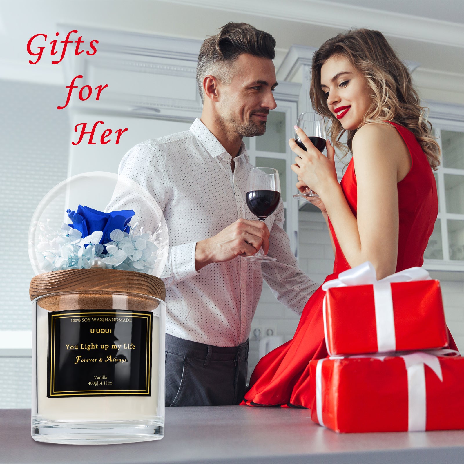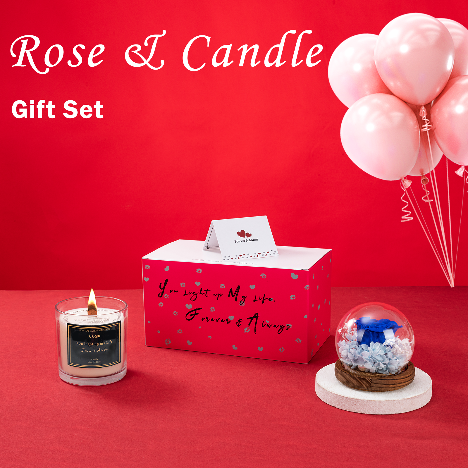 - Rose & Candle Valentine’s Day Gift Set: U UQUI valentines candle rose combination gift is newly launched, with a dual surprise that will meet your expectations for valentine’s gift selection. Forever rose in glass dome above the large candle, the entire gift is both ornamental and practical, can be as home decoration and aroma adjustment.