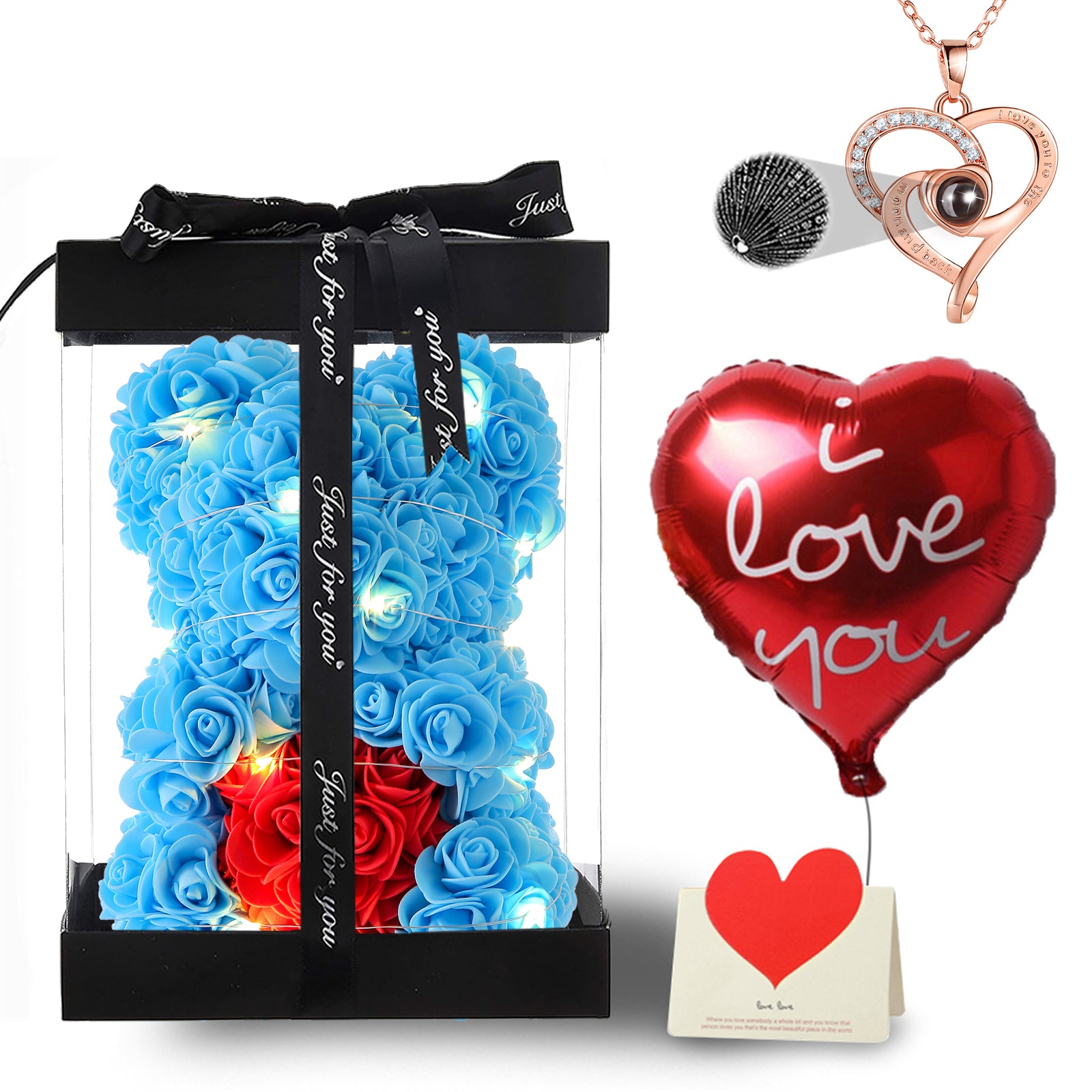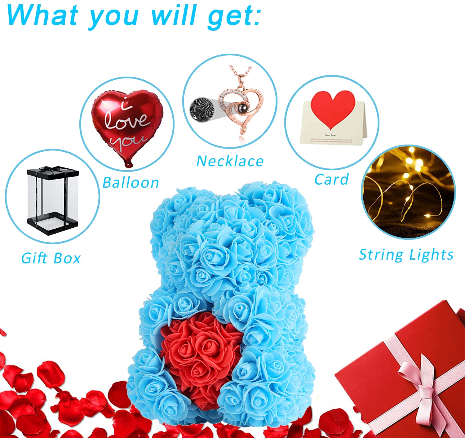 - Multi-surprise Valentines Day Gift Set -- Are you looking for valentines gifts for her? May be it’s hard to pick best valentine's day gifts for her of what you want. Now, here is the perfect 6 in 1 gifts set prepared for you, which includes 1* Red Rose Bear with White Heart + 1* Gift Box + 1* I Love You Necklace 100 Languages + 1* Heart Balloon + 1* Greeting Card + 1* String Lights.