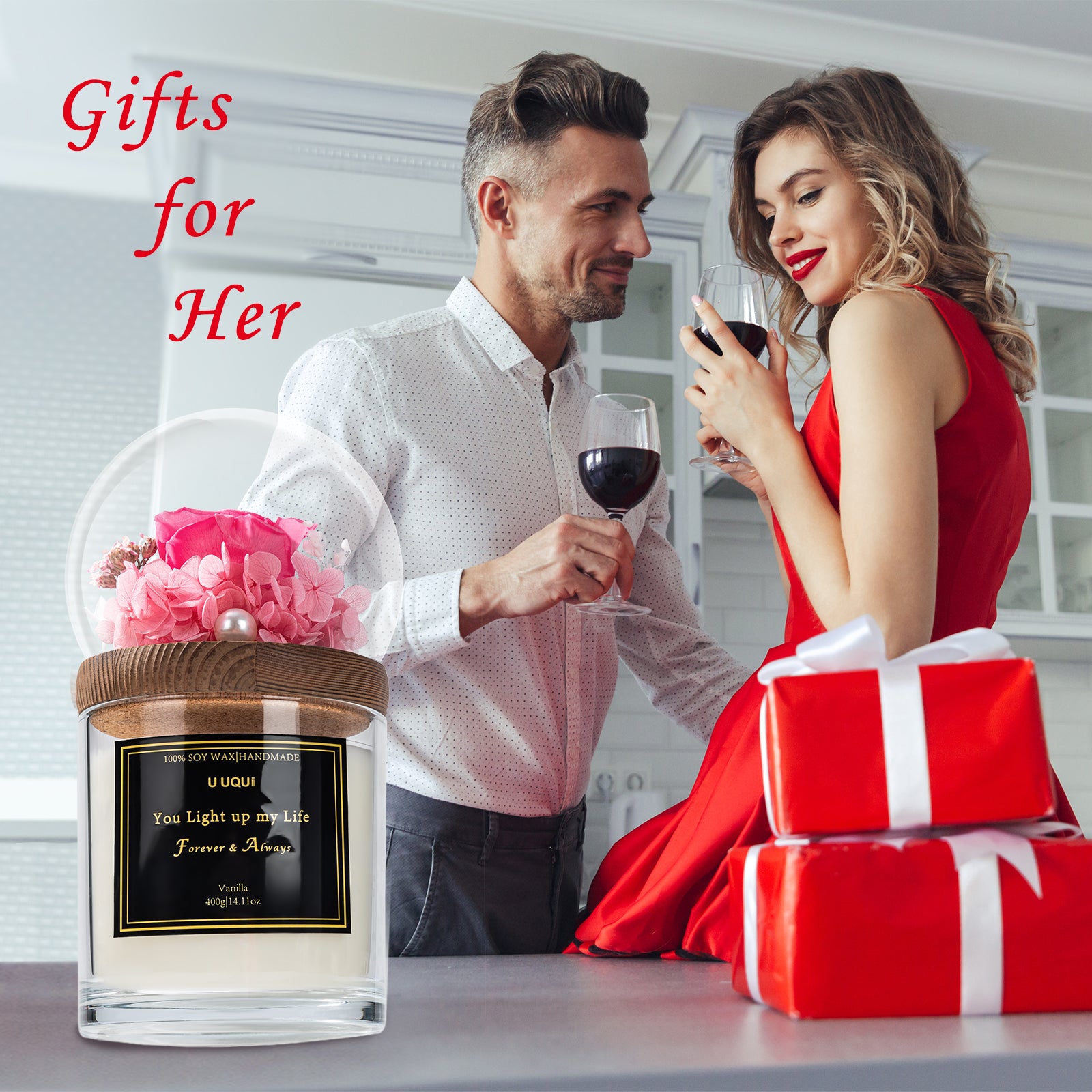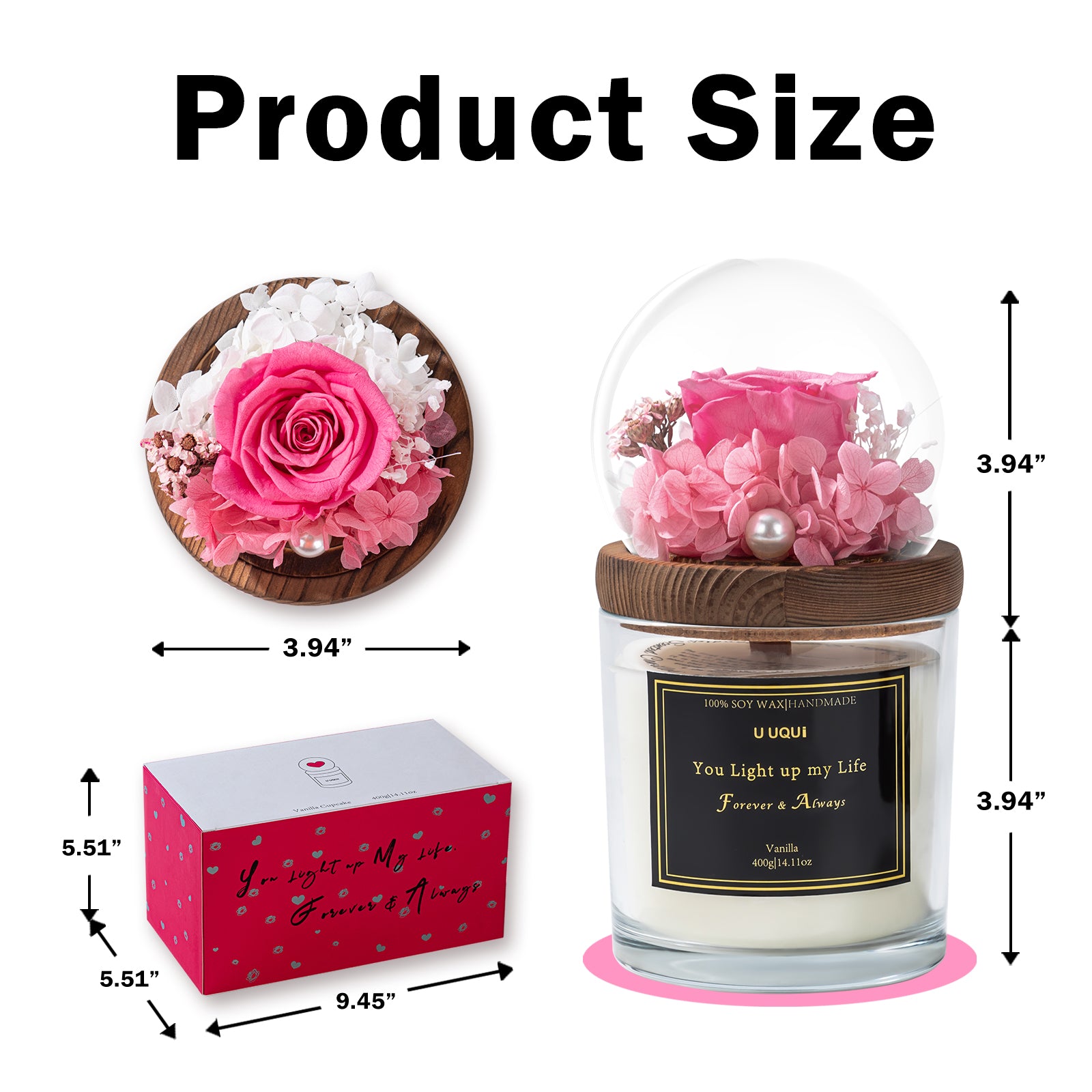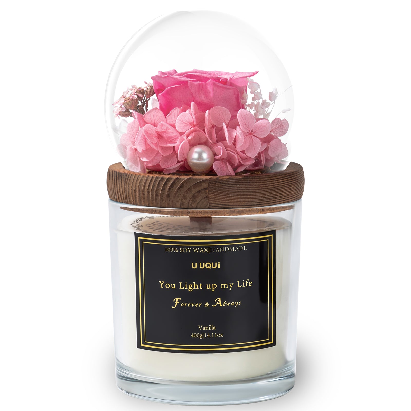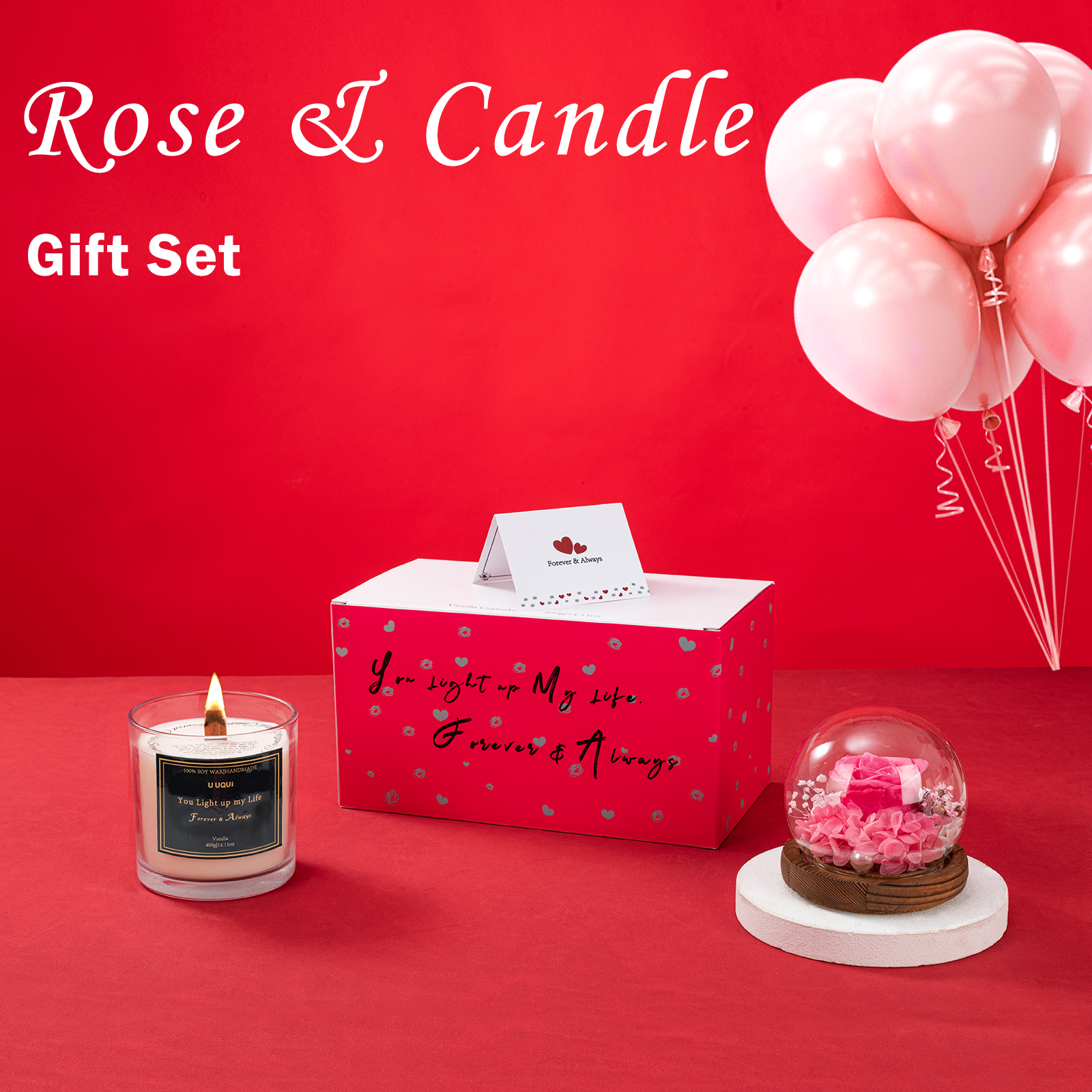 - Rose & Candle Valentine’s Day Gift Set: U UQUI valentines candle rose combination gift is newly launched, with a dual surprise that will meet your expectations for valentine’s gift selection. Forever rose in glass dome above the large candle, the entire gift is both ornamental and practical, can be as home decoration and aroma adjustment.