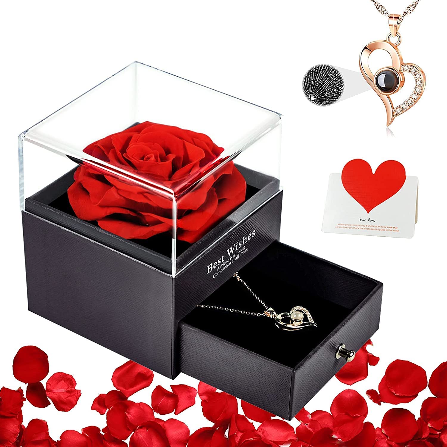- 【Package Include】A beautiful real rose + a love note card(You can write anything you want on this card) + a 100 languages I LOVE YOU necklace in the drawer, the drawer can also store rings or other jewelry. Beautiful Gifts on Valentines Day, Mothers Day, Christmas, Birthday, Anniversary, Thanksgiving Day etc.