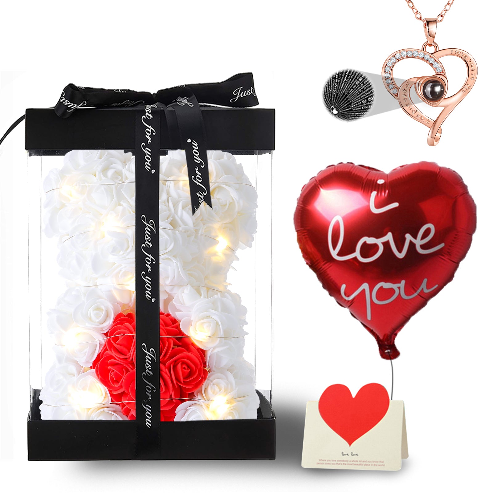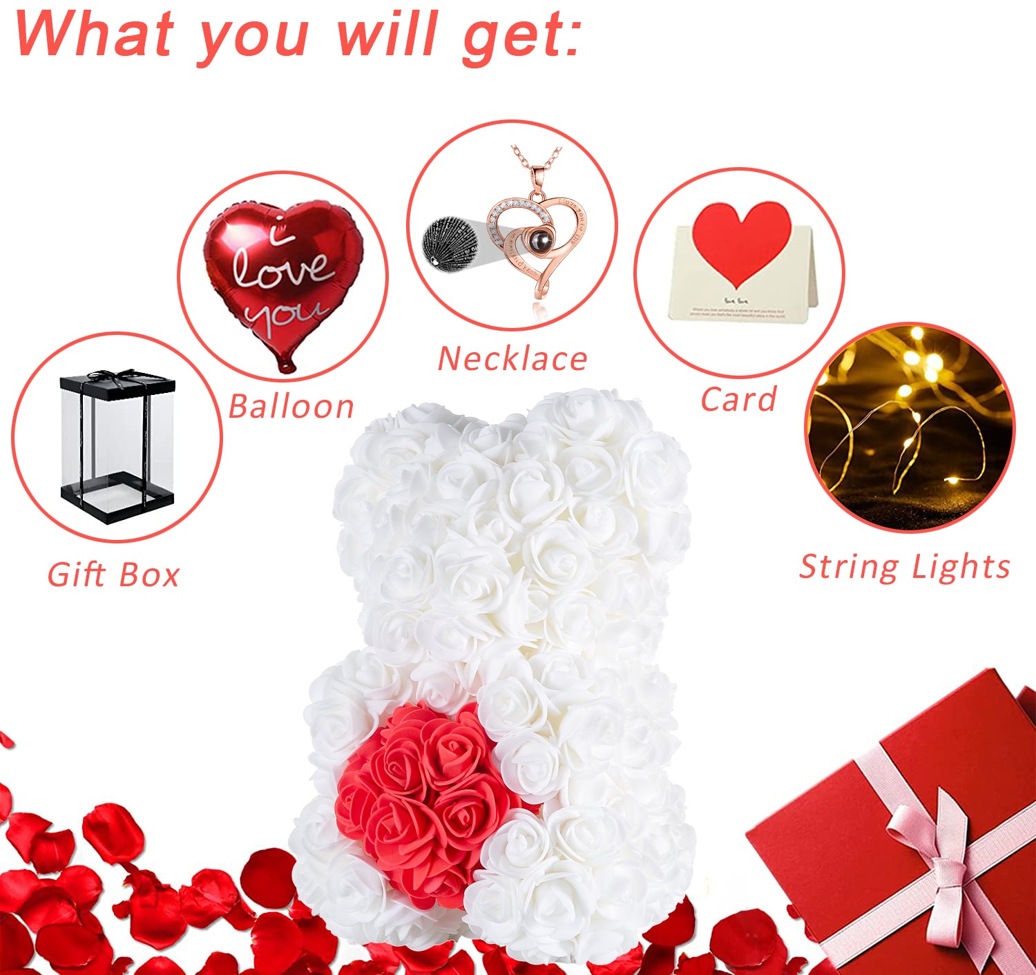- Multi-surprise Valentines Day Gift Set -- Are you looking for valentines gifts for her? May be it’s hard to pick best valentine's day gifts for her of what you want. Now, here is the perfect 6 in 1 gifts set prepared for you, which includes 1* Red Rose Bear with White Heart + 1* Gift Box + 1* I Love You Necklace 100 Languages + 1* Heart Balloon + 1* Greeting Card + 1* String Lights.
