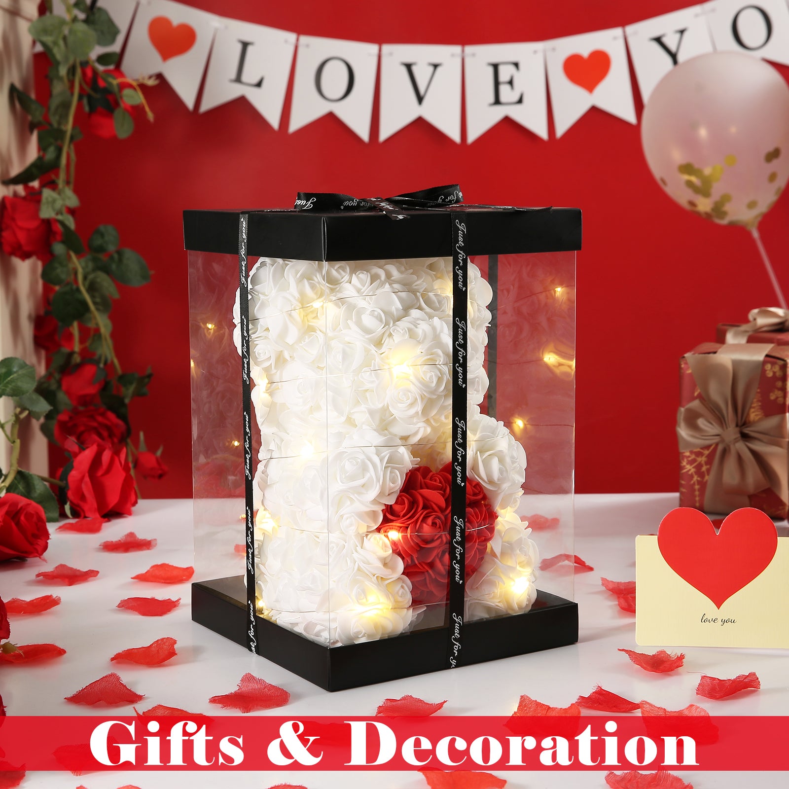 - As Valentines Day Decor -- Except as valentine's day present, rose bear with box is a cute valentines day decoration, with a display box, it can be cute shelf table desk decor, you will get a happy mood when you saw it. At Valentine's Day night, the light can create a warm and romantic atmosphere, it will be a great surprise as valentines day living room decor or bedroom decor.